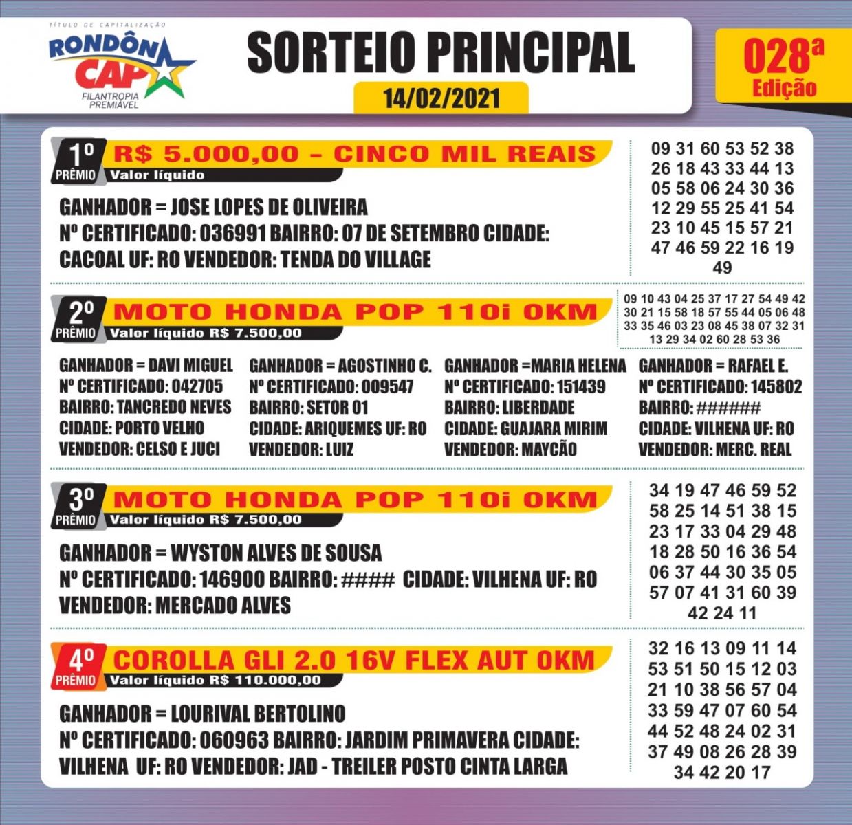 Confira quem foram os ganhadores do sorteio principal e dos giros da sorte: