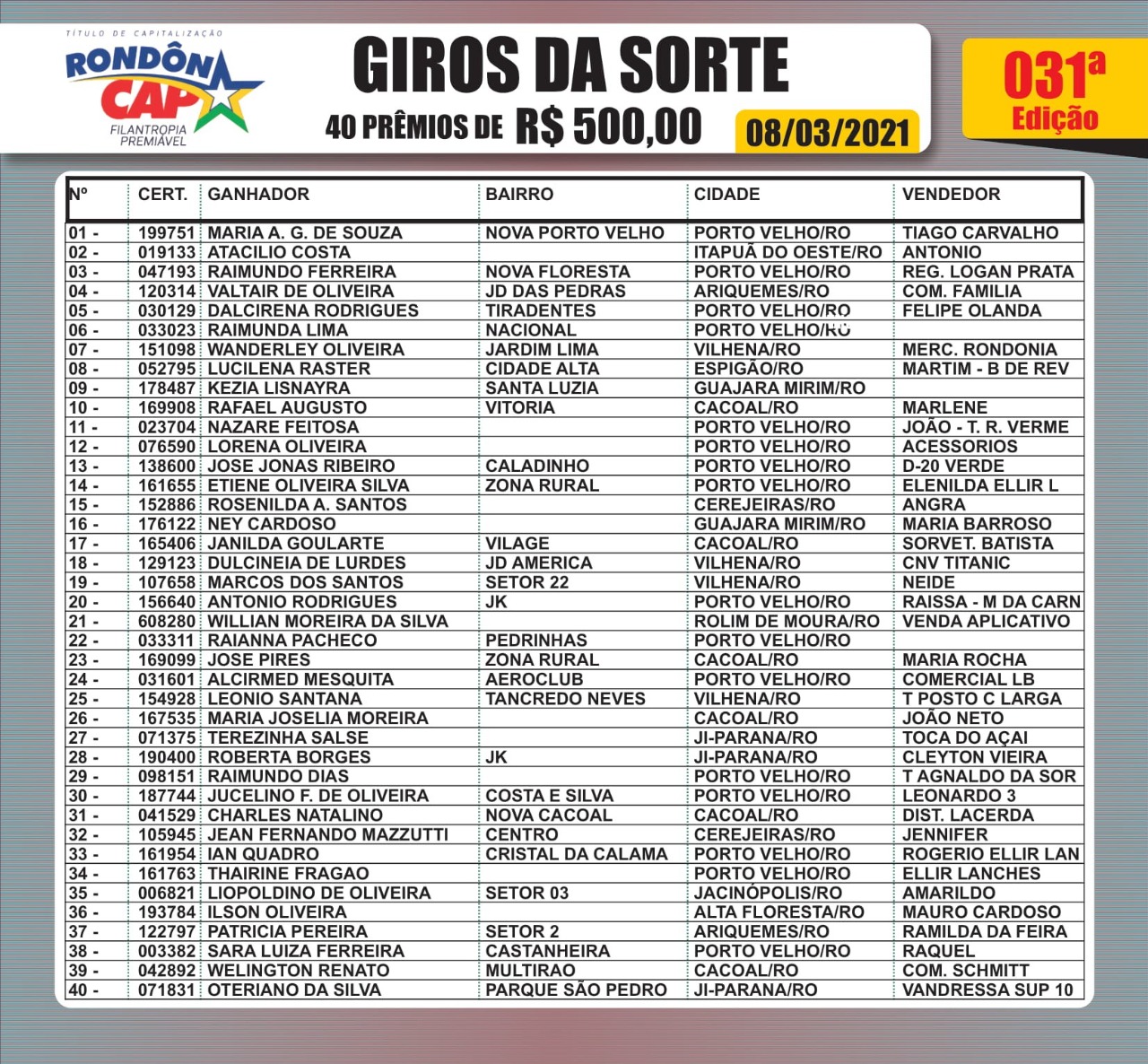 O Rondoncap já fez mais de 11 mil ganhadores nos municípios de Rondônia e no sorteio de ontem não foi diferente. E quem ganha no Rondoncap todo mundo ver!