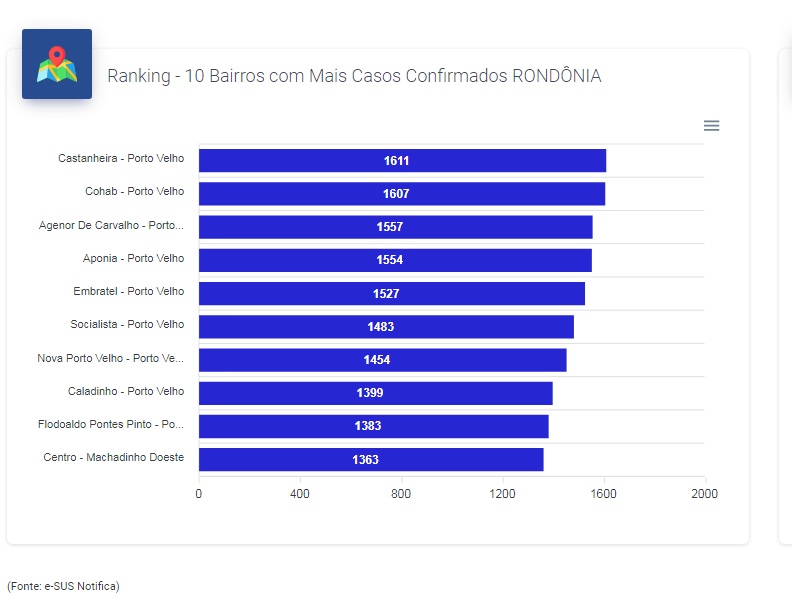 Na lista dos dez bairros com maior índice de registros de casos de COVID-19 nove são de Porto Velho, apenas o bairro Centro do município de Machadinho do Oeste, com 1.363 casos aparece na lista.