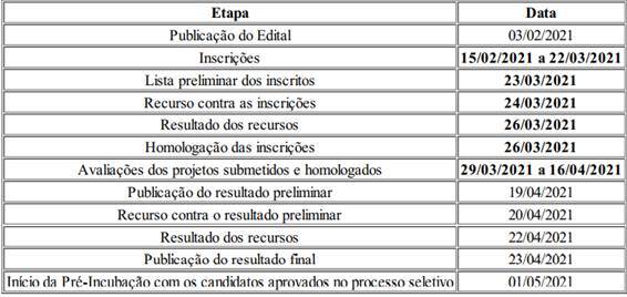 Confira na tabela abaixo as etapas até o início da pré-incubação com os aprovados: