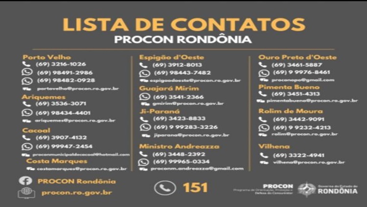 A instituição de defesa do consumidor de Rondônia conta com cinco gerências regionais que estão instaladas em Porto Velho, Ji-Paraná, Ariquemes, Rolim de Moura, Vilhena, Pimenta Bueno, Espigão D’Oeste, Guajará-Mirim e Ouro Preto do Oeste, com a missão institucional de orientar e defender o consumidor em suas relações comerciais.