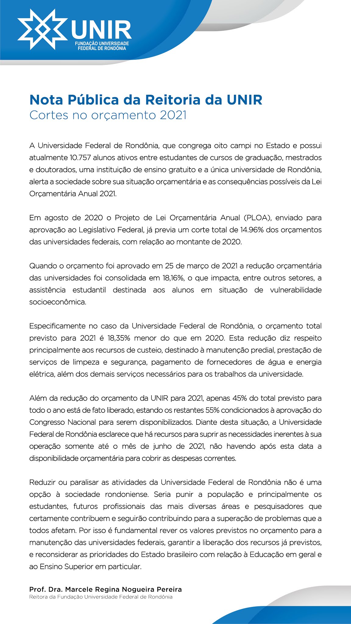 A Universidade Federal de Rondônia (UNIR) se manifestou através de nota oficial e ao ser procurada pelo Rondoniaovivo, em relação ao corte orçamentário para 2021 de pelo menos R$ 1 bilhão. Essa informação foi repassada pela Associação Nacional dos Dirigentes das Instituições Federais de Ensino Superior (Andifes).