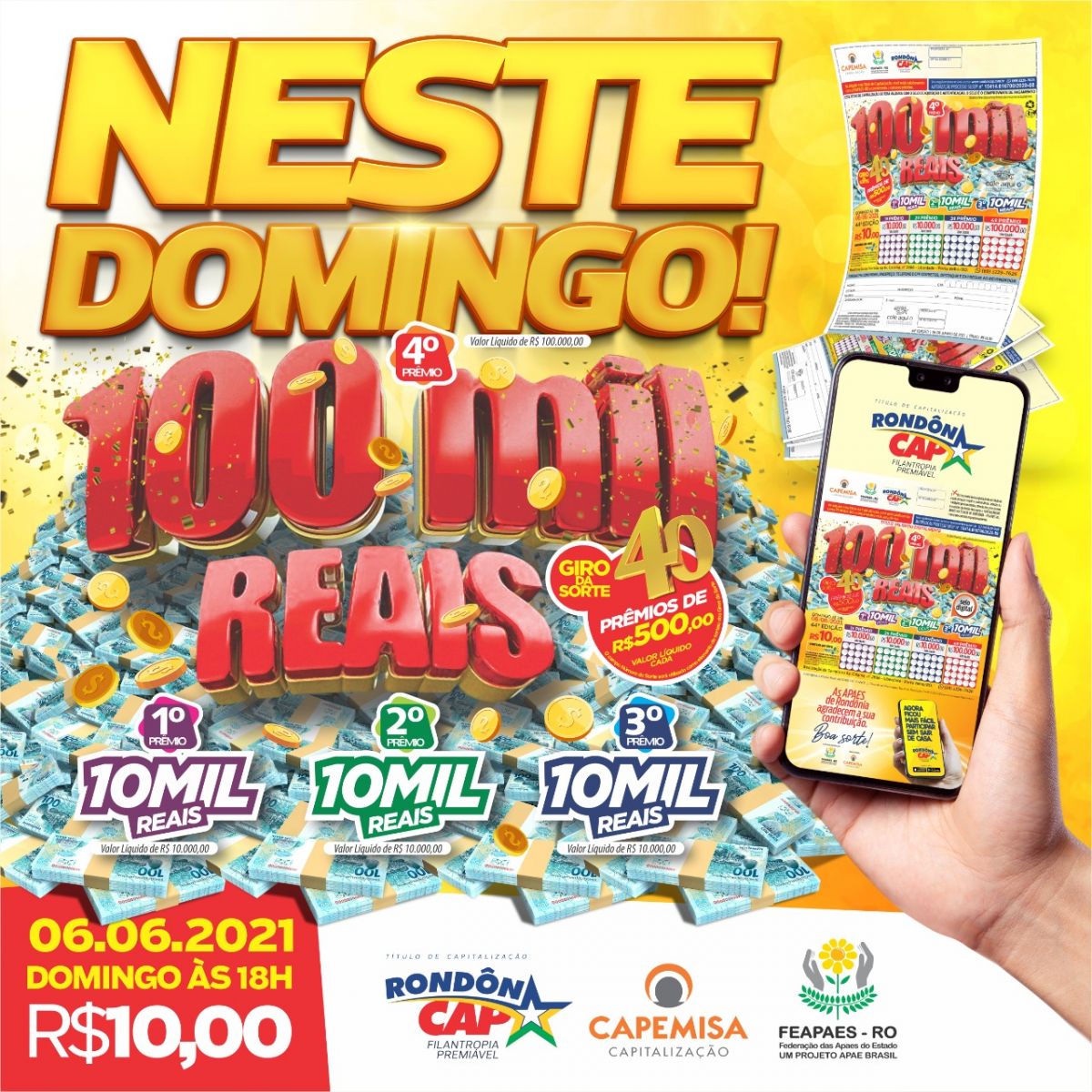 E ainda tem R$ 10 mil no terceiro, R$ 10 mil no segundo, R$ 10 mil no primeiro prêmio e mais 40 giros da sorte de R$ 500 reais cada! E o título? Só R$ 10 reais.