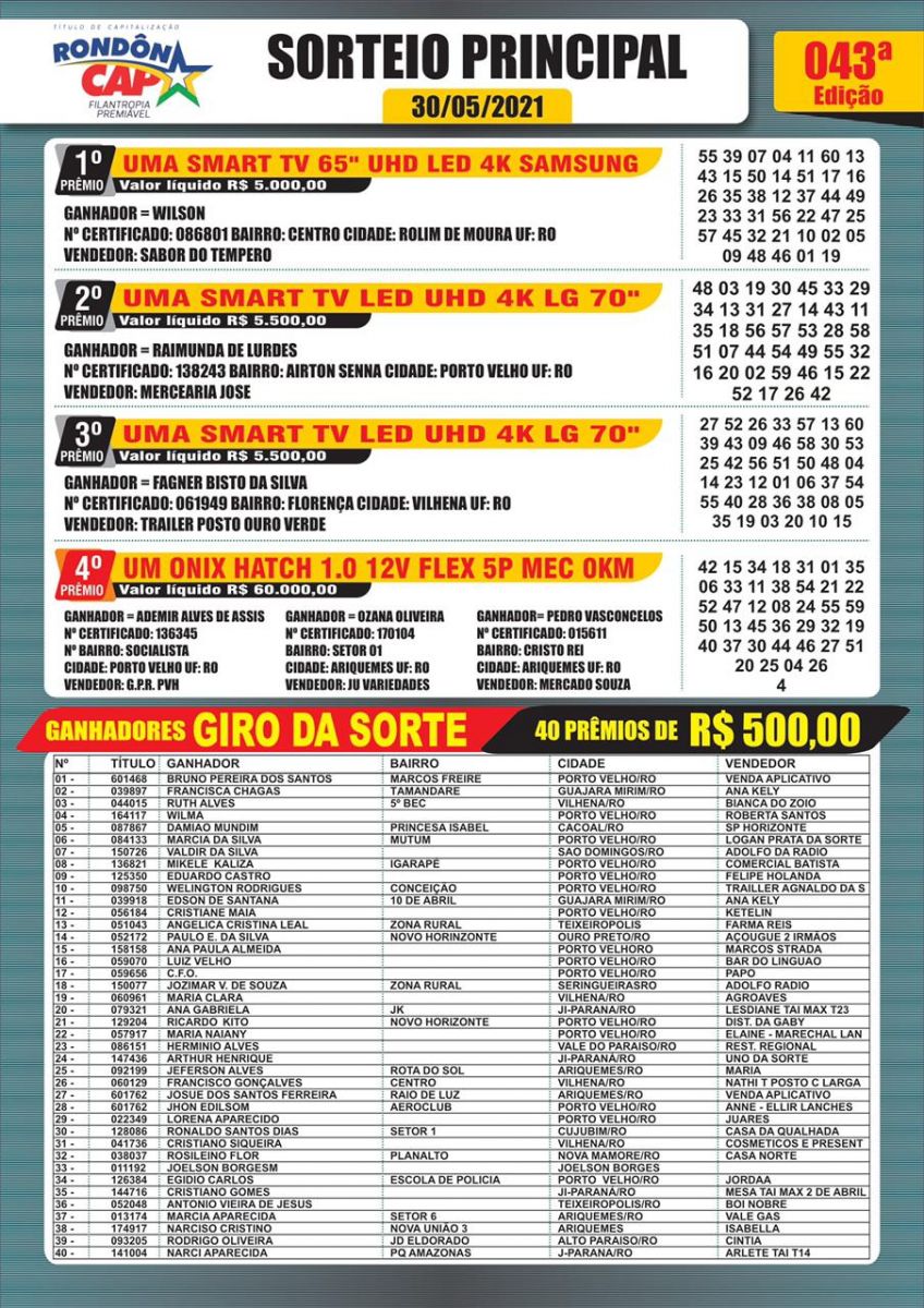 Confira os ganhadores do sorteio principal e do giro da sorte:
