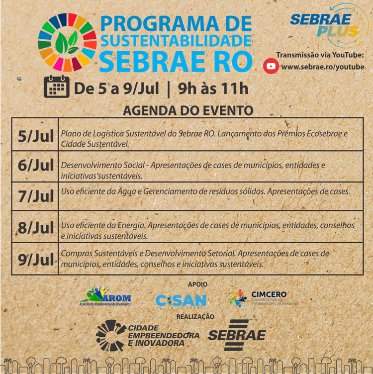 Além da abertura, programada para as 9h às 11h da manhã de segunda (5), a programação se estende até o dia 9 (sexta-feira), sempre das 9h às 11h, com apresentações de casos de sucessos a partir da iniciativa privada, poder público e terceiro setor, que tenham, como mote ações que promovam a sustentabilidade. Para assistir aos conteúdos, bata acessar o canal do YouTube do sebrae em Rondônia pelo link