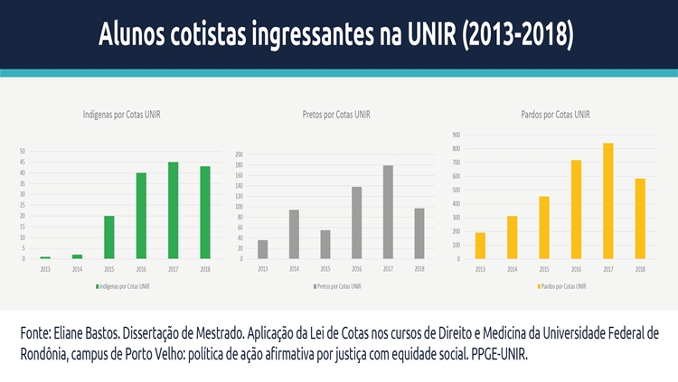A quantidade de alunos pretos matriculados na UNIR cresceu 397% desde 2013, e o de alunos pardos teve um acréscimo de 389%, dados que foram compilados na dissertação defendida por Eliane Bastos. No caso de indígenas, o impacto foi ainda mais profundo, havendo um aumento de incríveis 13.000% no número de alunos matriculados.