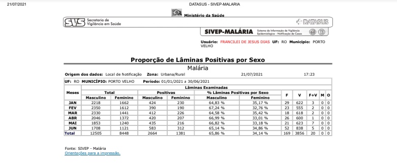 Pelos dados, em Porto Velho, os homens com idade entre 30 e 39 anos foram os que mais contraíram malária. Dos que se contaminaram com a doença, 65,86% eram do sexo masculino, enquanto a porcentagem do feminino foi de 34,14% dos casos.
