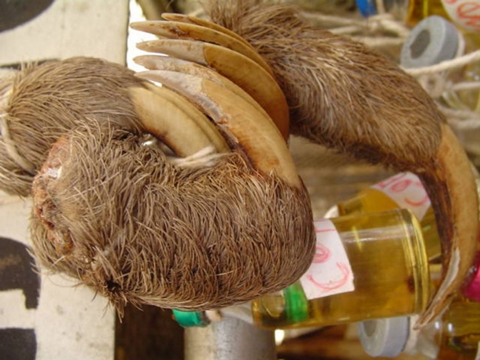 Patas de bicho-preguiça à venda no Mercado Ver-o-Peso, em Belém (PA). Foto: Marcelo Pavlenco Rocha/SOS Fauna.