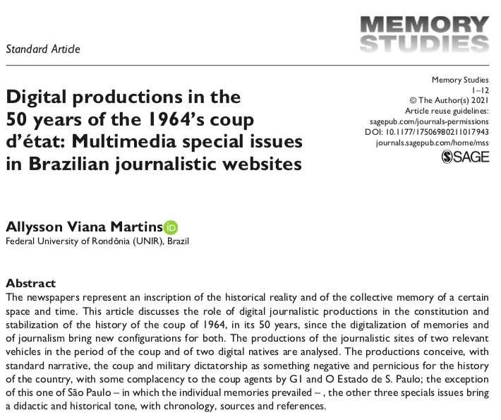A principal revista acadêmica mundial sobre os estudos da memória publicou o artigo de Allysson Martins, professor de Jornalismo e coordenador do MíDI na Universidade Federal de Rondônia (UNIR). A versão OnlineFirst do artigo "Digital productions in the 50 years of the 1964's coup d'etat" já está disponível para que os leitores interessados tenham acesso antes da incorporação do texto em edição própria do periódico científico.