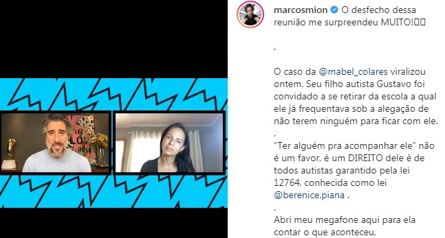 Na tarde da última terça-feira (17), o apresentador recém-contratado pela TV Globo, Marcos Mion, fez uma live no Instagram, com Mabel Colares, mãe de Gustavo, de 09 anos de idade, estudante autista que foi convidado a se retirar da sala de aula da escola Santa Marcelina, unidade do bairro Embratel.