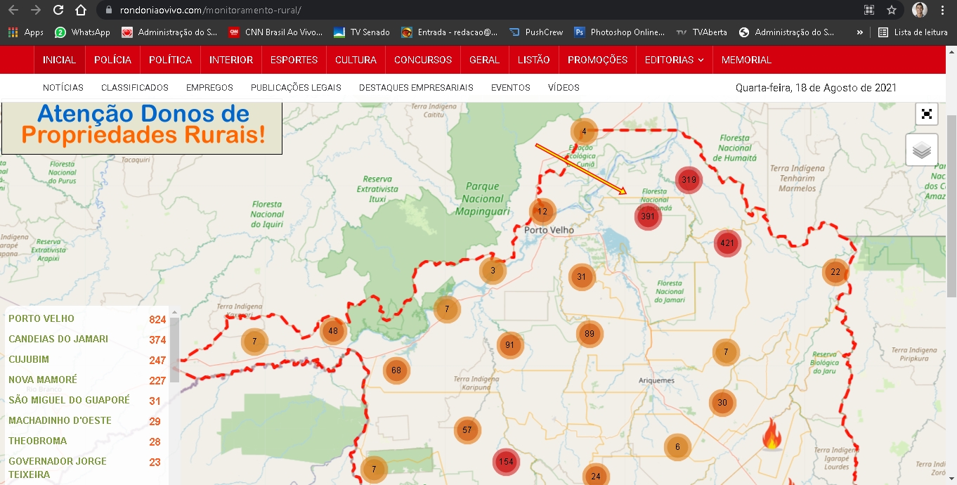 Rondoniaovivo, está disponibilizando um levantamento em tempo real da situação das queimadas em Rondônia. Nesta quarta-feira (18), foram registrados 1942 focos de queimadas em todo o estado.