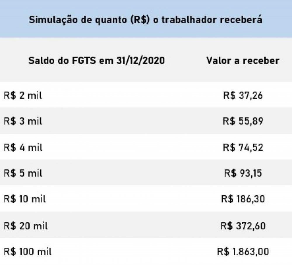 Quem ainda não recebeu, pode calcular o valor que será creditado na conta do FGTS até o fim do mês por meio de uma fórmula simples: basta multiplicar o saldo da conta no último dia do exercício de 2020 por 0,01863517. Para cada R$ 100 em saldo nesta data, o trabalhador receberá R$ 1,86 de lucro, por exemplo.