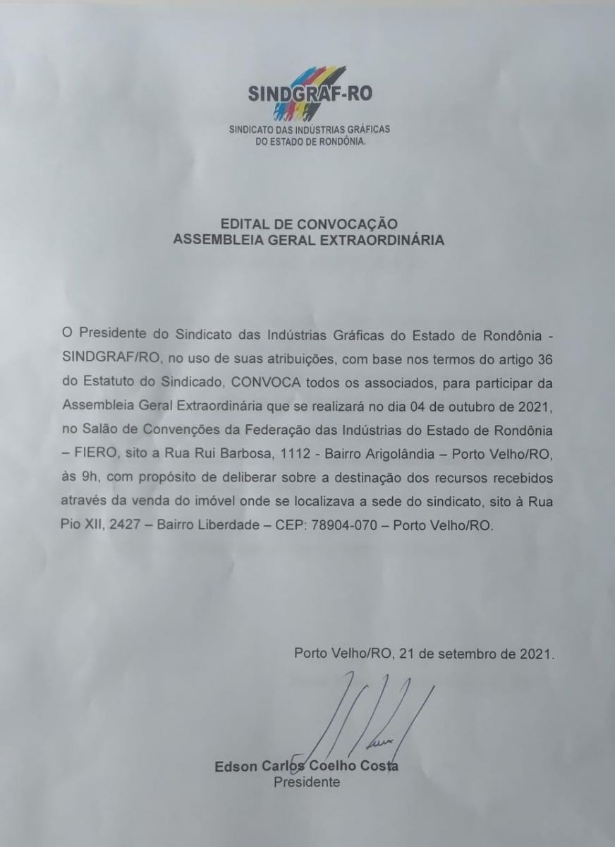 Nesta semana, 10 membros procuraram o presidente do Sindgraf, Edson Carlos Coelho Costa, que divulgou às pressas um ofício convocando uma assembleia extraordinária, no dia 04 de outubro (segunda-feira), às 09 da manhã, para a discutirem o tema.
