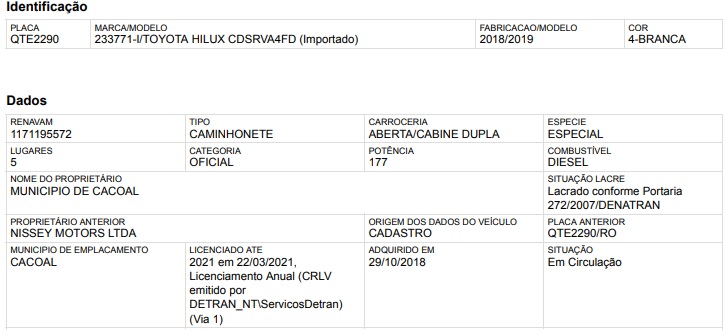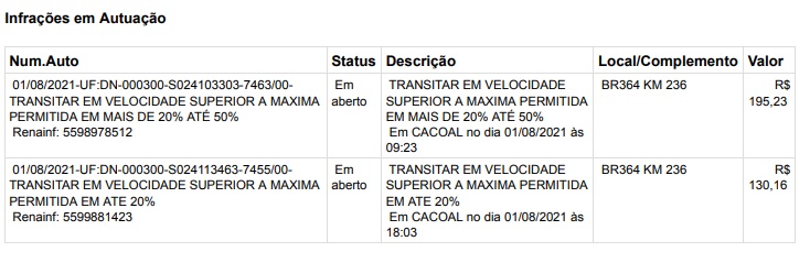 Uma autuação foi “transitar em velocidade superior à máxima permitida em mais de 20% até 50%”, na BR-364, quilômetro 236, no dia 01/08/2021, às 09:23, em Cacoal. Valor: R$ 195,23.