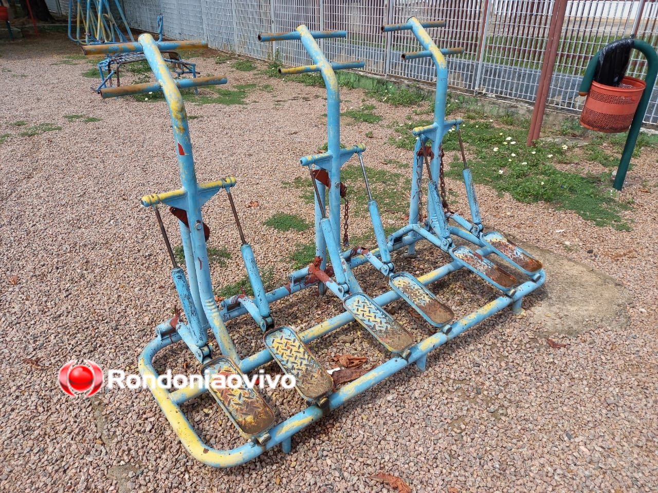 Os equipamentos feitos com cimento estão quebrados, outros sem cordas para puxar os pesos. Um ou outro ainda resiste bravamente ao sol e chuva, sem nenhum tipo de manutenção.