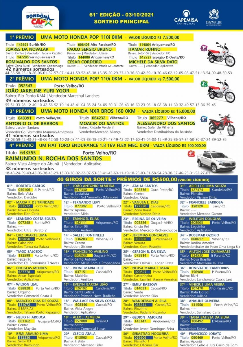 Confira agora os ganhadores do sorteio principal e do giro da sorte: