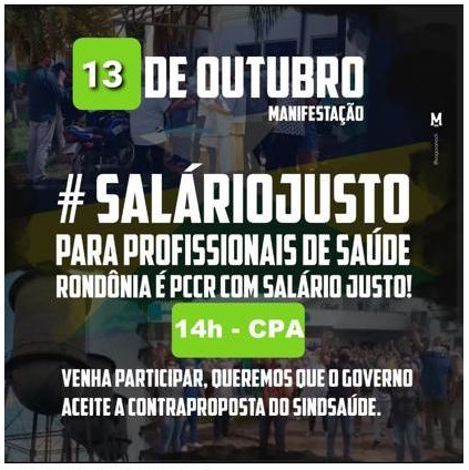 No começo da tarde desta quarta-feira (13), às 14 horas, está prevista nova manifestação dos servidores da saúde, coordenados pelo sindicato da categoria, o Sindsaúde, na frente do Palácio Rio Madeira (antigo CPA).