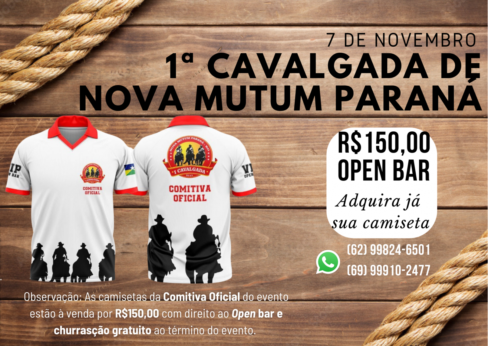 As camisetas da Comitiva Oficial da “1ª Cavalgada de Nova Mutum Paraná” estão à venda no valor de R$150,00 (cento e cinquenta reais), as pessoas que adquirirem as camisetas terão direito ao Open Bar com churrasco no encerramento do evento.