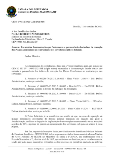 Inteirado pela Diretoria do Sindicato dos Servidores Públicos Federais do Estado de Rondônia – Sindsef/RO, com todas as informações pertinentes, o deputado federal Mauro Nazif encaminhou ao Ministério da Economia, um rol de documentação que sustenta a permanência dos índices de correção dos Planos Econômicos no contracheque dos servidores beneficiários do Ministério da Saúde e Funasa.