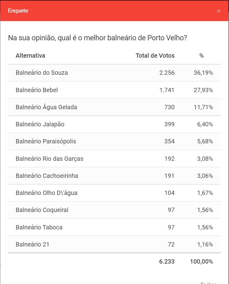 Souza somou 36,19% das preferências com 2.256 votos. Em seguida apareceu o Balneário Bebel que teve 27,93% com 1.741 votos. Em terceiro ficou o Balneário Água Gelada, 11,71%, alcançando 730 votos. Ao todo, 6233 internautas participaram da votação.