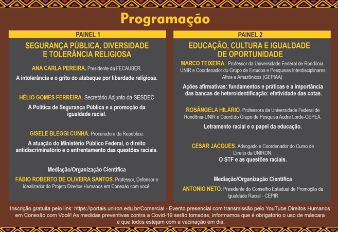 “I Encontro Rondoniense Zumbi e Dandara dos Palmares um grito de união: Respeito, Diálogo Interinstitucional, Segurança Pública, Diversidade e Igualdade Racial”, das 9h às 12h. Para abrilhantar o evento, estarão presentes diversos palestrantes.