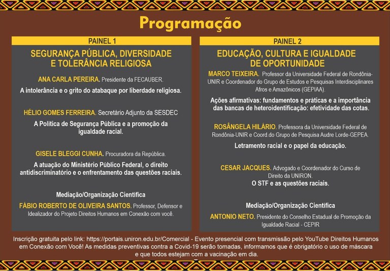O evento é uma realização do Conselho Estadual de Promoção da Igualdade Racial e do canal Direito Humanos em Conexão com Você, com apoio da Uniron, MPF, OAB, Sesdec, Gepea Audre Lorde, Fecauber, Juntos Pela Inclusão, Gepiaa, Neabi e Cufa.