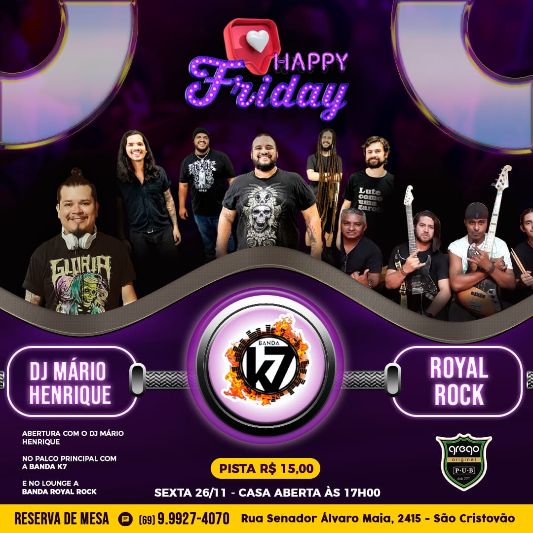 Nesta sexta-feira, dia 26, das 17h às 00h30, o Grego Original estará com promoções de chopp e petiscos vai rolar apresentação do DJ Mário Henrique e shows das bandas K7, no palco principal, e Royal Rock no palco lounge.