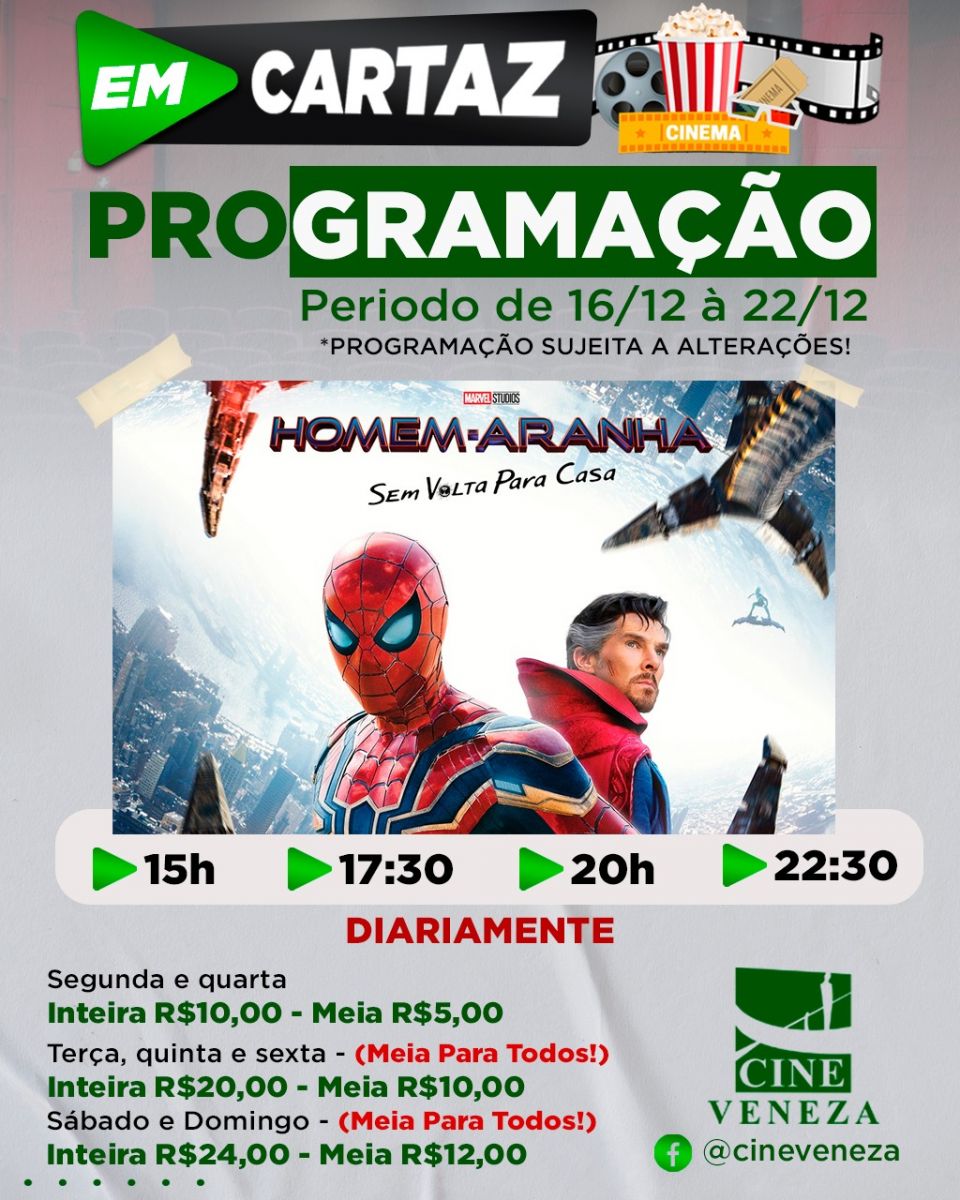 Nesta quarta (15), acontece a pré-estreia do tão esperado filme "Homem-Aranha: Sem Volta Pra Casa" no Cine Veneza. Em sessões especiais, o longa será reproduzido em três horários: 19h, 21h30 e 00h01.