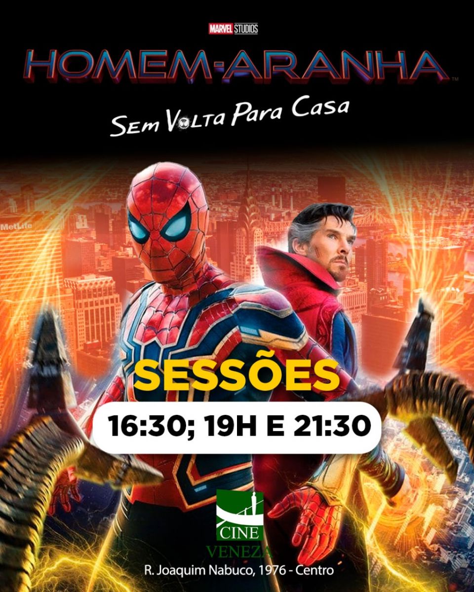 Ao longo dessa semana, o Cine Veneza está disponibilizando três sessões para quem deseja assistir "Homem-Aranha: Sem Volta Pra Casa". Nos horários das 16h30, 19h e 21h30.