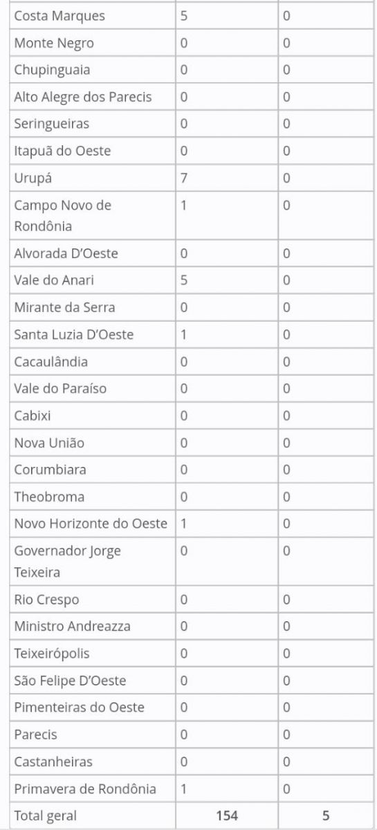 Rondônia registrou na última segunda-feira (27), 154 casos e cinco óbitos por covid-19, sendo as vítimas nos municípios de Cacoal (2), Pimenta Bueno (1), Buritis (1) e Ouro Preto D´Oeste (1).
