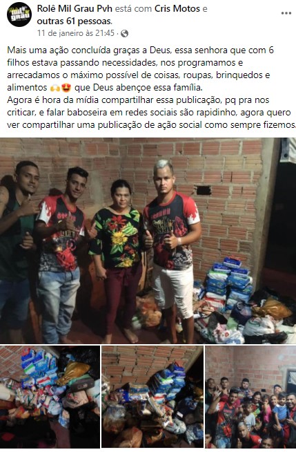 Pouco tempo depois, ela já começou a receber doações de alimentos, como cestas básicas, carne e frango. Depois, foi a vez de um grupo de “rolêzinhos” de motos levar uma grande quantidade de produtos arrecadados.