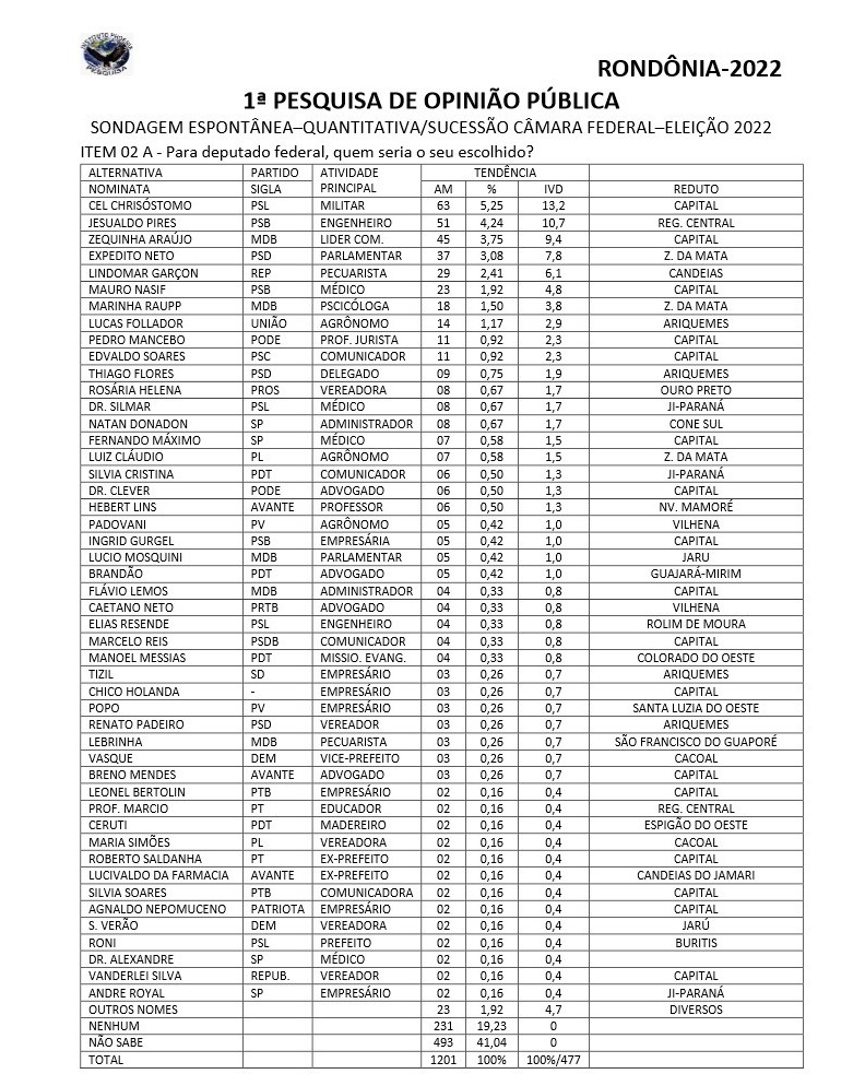 Esse levantamento mostrou que a corrida para Deputado Federal em Rondônia está bem acirrada. A bancada rondoniense na Câmara Federal é formada por oito parlamentares. Segundo os números levantados pelo Instituto de Pesquisa Phoenix & Associados na frente aparece o atual deputado federal Coronel Chrisóstomo (PSL), com 13,2% da preferência dos eleitores.