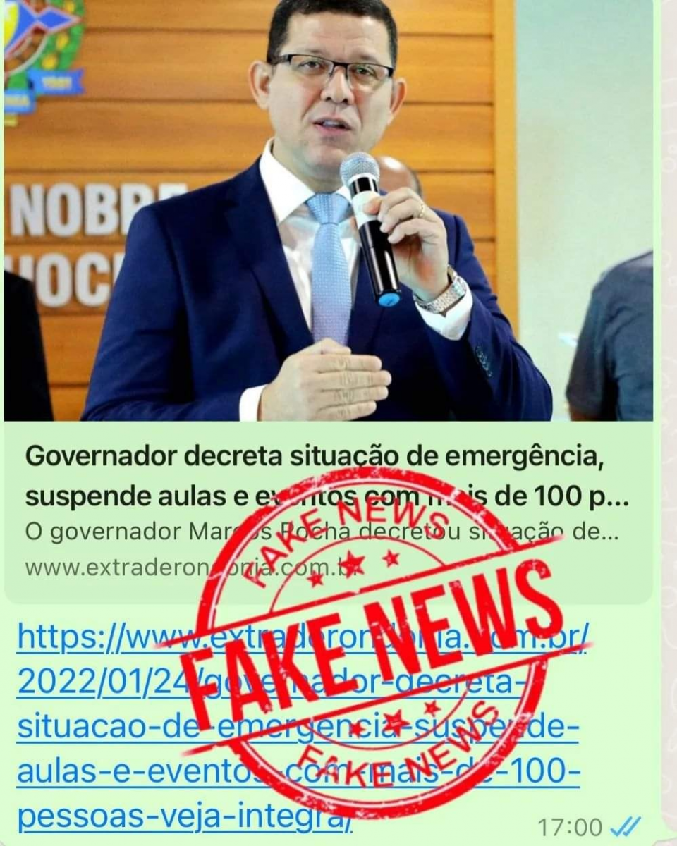 O Governo do Estado de Rondônia esclarece sobre informações falsas divulgadas através de alguns veículos de comunicação ou em redes sociais quanto à notícia sobre o decreto de situação de emergência, suspensão de aulas e eventos com mais de 100 pessoas.