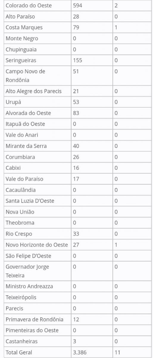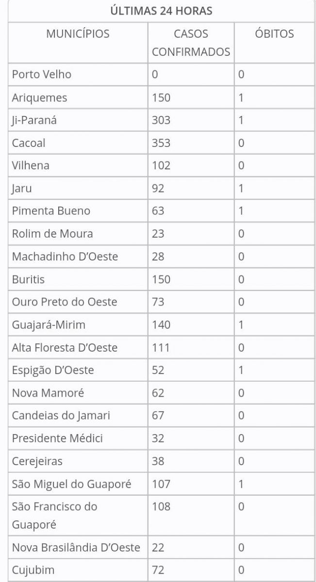 Nas últimas 24 horas, a capital portovelhense não contabilizou nenhum caso e nenhuma morte pela doença. As cidades do interior em que mais registraram novos casos, foram: Colorado do Oeste (594), Cacoal (353), Ji-Paraná (303) e Seringueiras (155).