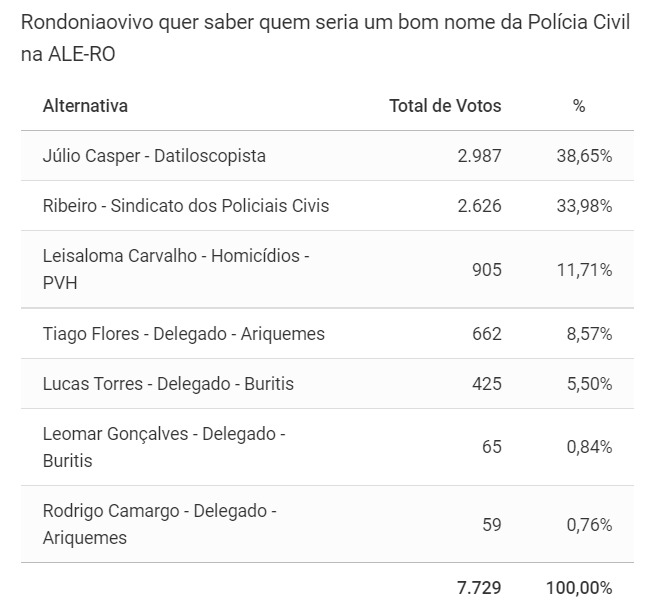 O resultado da enquete realizada pelo Rondoniavivo para saber quem seriam os nomes na preferência dos internautas para representar a Polícia Civil na Assembleia Legislativa de Rondônia, mostrou em primeiro lugar o datiloscopista Júlio Casper, com 2.987 votos (38,65%).