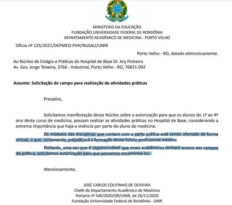 Um ofício assinado no dia 16 de dezembro, pelo chefe de departamento de Medicina da UNIR, José Carlos Coutinho de Oliveira, pede “autorização para que os alunos do 1º ao 4º ano deste curso de medicina, possam realizar as atividades práticas no Hospital de Base, considerando a extrema importância que haja a vivência por parte do aluno de medicina”.