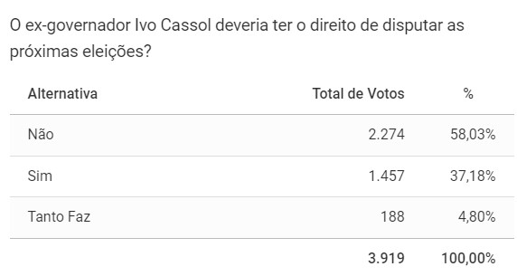 A opção que apontava que Cassol NÃO deveria ter o direito de disputar as próximas eleições foi a primeira colocada com 2.274 votos ou 58,03% do total.