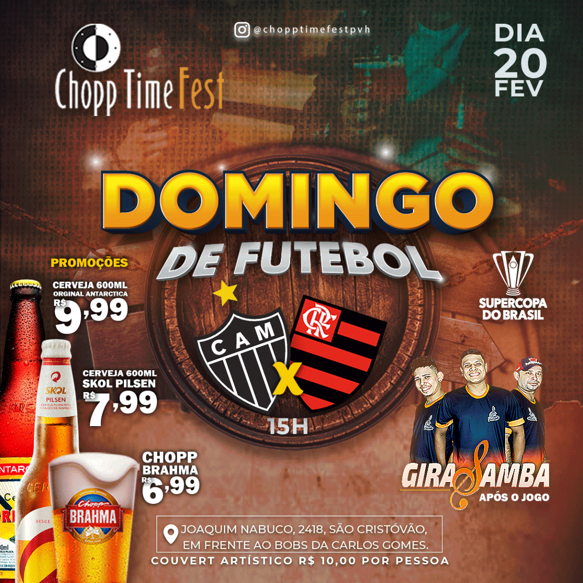 Chopp Time Fest irá promover, mais um mega evento neste domingo (20). A final da Supercopa do Brasil entre Flamengo e Atlético-MG será transmitida ao vivo às 15h e após o jogo, a animação é com o grupo Girasamba.