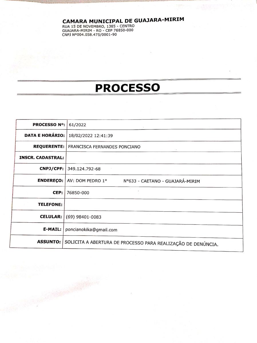 No documento, Francisca Fernandes Ponciano, moradora da cidade relatou diversos crimes supostamente cometidos pela prefeita. Os mais graves foram na saúde, que neste momento está com seu oitavo secretário.