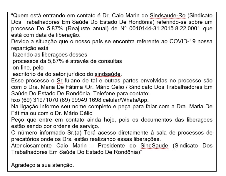 ATENÇÃO SRS. SERVIDORES DA SAÚDE, o SINDSAUDE/RO , está recebendo várias denúncias de seus filiados relatando que estão recebendo mensagens via Whatsap e ligação telefônica em nome do Sindsaude e de sua Assessoria Jurídica, em nome de dois falsos advogados (Dra. Maria de Fátia e o Dr. Mário Célio), solicitando dados pessoais e também enviando boletos para que sejam pagos como antecipação de uma possível ação judicial no qual o servidor seria beneficiado com um considerável valor.