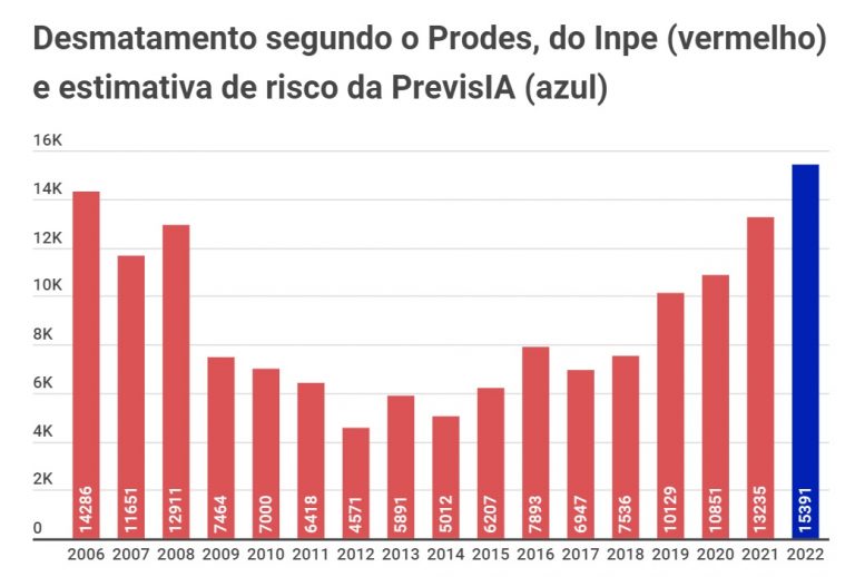 Ou seja: conforme a ferramenta, esses mais de 15 mil km² podem ser atingidos entre agosto de 2021 e julho de 2022. Caso se concretize, o desmatamento será o maior desde 2006, segundo a série histórica do Instituto Nacional de Pesquisas Espaciais (INPE).