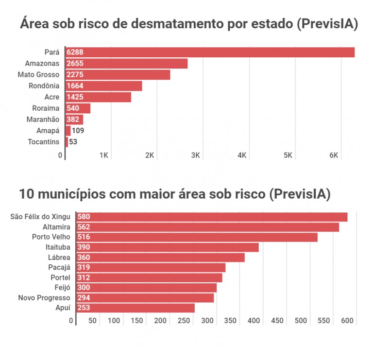 As estimativas são da plataforma de inteligência artificial PrevisIA, do Instituto do Homem e Meio Ambiente (Imazon), que apontam para 15.391 km² sob risco de devastação, uma área quase três vezes maior do que o Distrito Federal.
