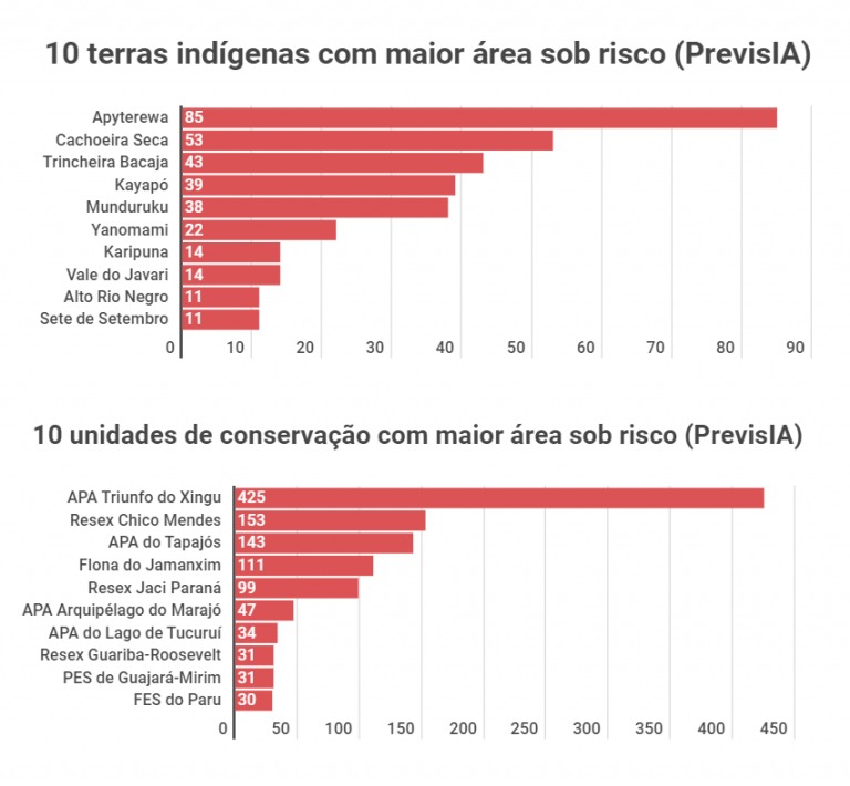 Em relação às áreas protegidas da Amazônia, a PrevisIA mostra que 725 terras indígenas, unidades de conservação e quilombos estão sob risco de desmatamento, o que representa 90% do total, que é de 803 territórios. Desse total, 24% das áreas estão sob risco alto ou muito alto de derrubada da floresta.
