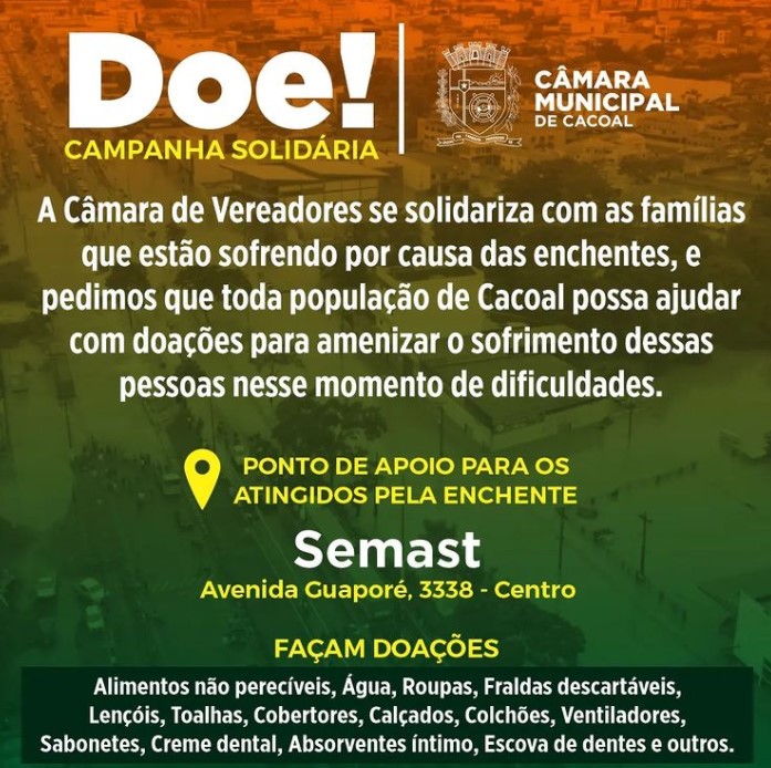 Um dos pontos de arrecadação é a Secretaria Municipal de Assistência Social e Trabalho (Semast), na Avenida Guaporé, 3338, Centro de Cacoal.