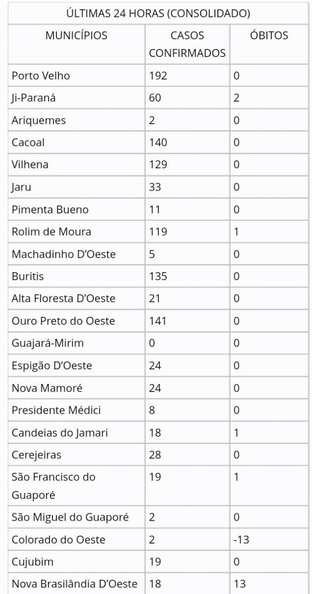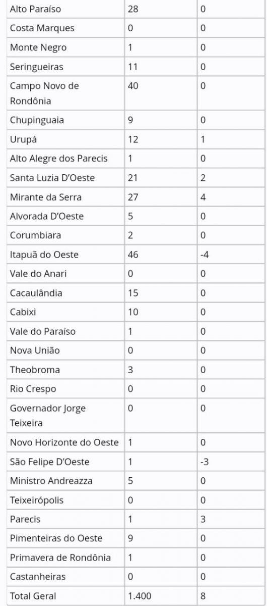 De acordo com o boletim diário, as mortes ocorreram nos municípios de Mirante, Santa Luzia, Urupá, Sao Francisco do Guaporé, Candeias, Rolim e Ji-Paraná.