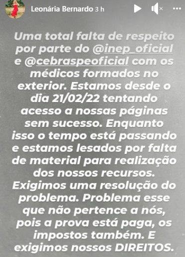 “Fiz a prova de habilidades do Revalida em dezembro e no dia 21 de fevereiro, liberaram as notas fora do horário. Eu percebi aí que estava reprovada. Decidi entrar com recurso, mas não conseguimos ter acessos aos nossos vídeos. Pra completar, a plataforma aparece o nome de outra pessoa. Já tirei várias fotos da tela e muda o nome da pessoa, mas nada acontece”, protestou Jéssica.