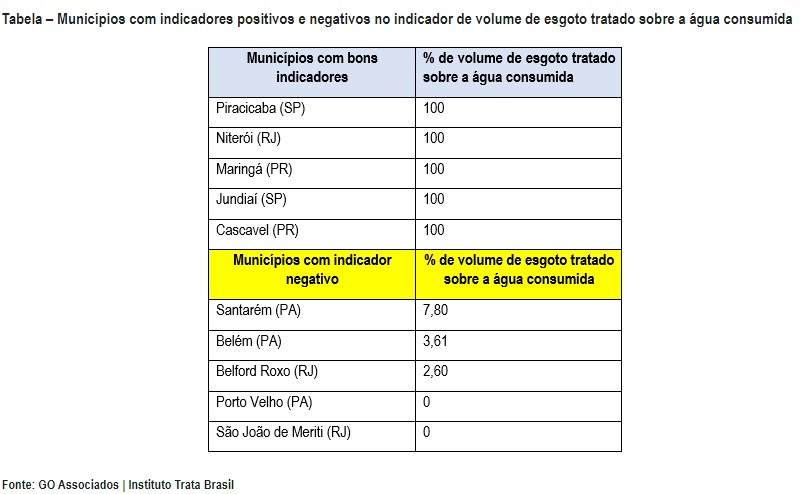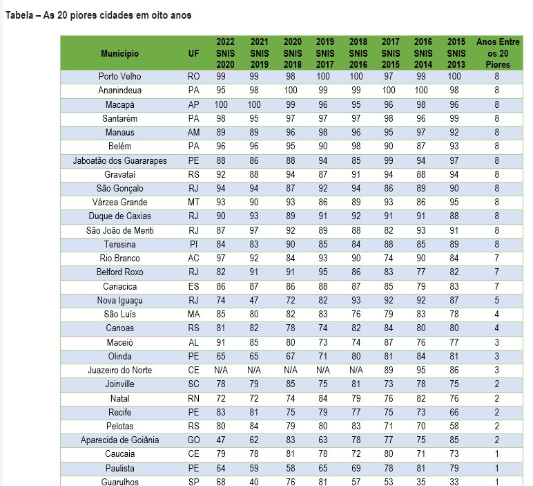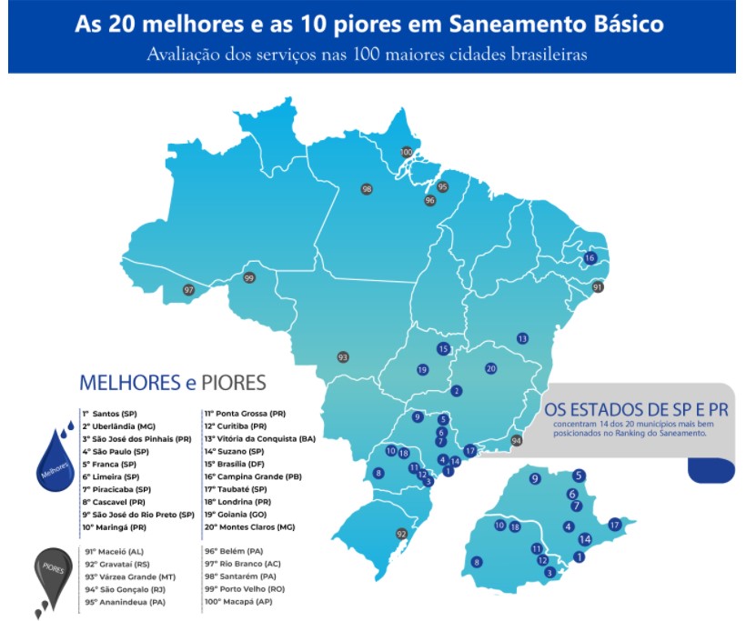 Historicamente, o que se observa nas tabelas publicadas Trata Brasil são uma predominância de municípios dos estados do Paraná, São Paulo e Minas Gerais ocupando as primeiras posições.