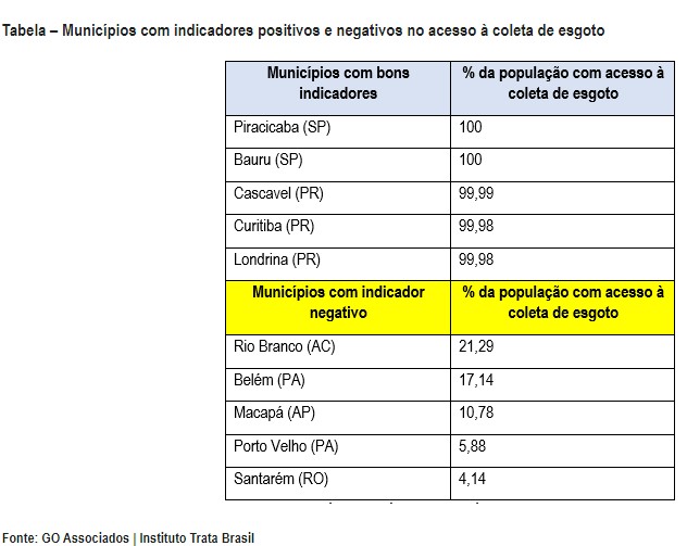 O menor percentual de população atendida com serviço de coleta de esgoto na amostra foi 4,14%, no município de Santarém (PA). Porto Velho ficou na penúltima posição com apenas 5,88% do esgoto total recolhido.