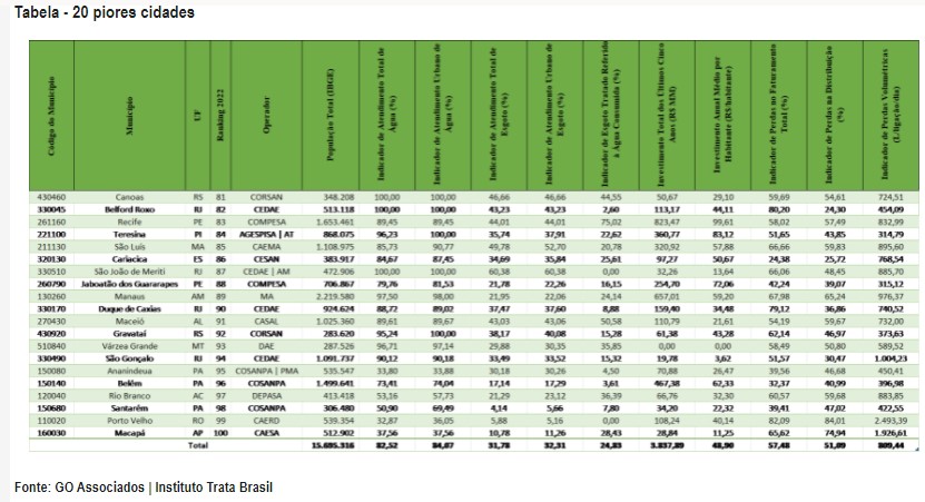 Nesta terça-feira (22), o Instituto Trata Brasil, que faz diversos estudos no abastecimento de água potável e tratamento de esgoto no país, enviou um novo levantamento ao