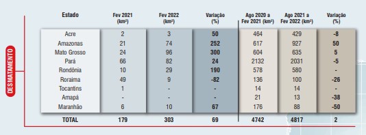 O SAD detectou no total, 303 quilômetros quadrados de desmatamento na Amazônia Legal. Um aumento de 69% em relação a fevereiro de 2021, quando o desmatamento somou 179 quilômetros quadrados.